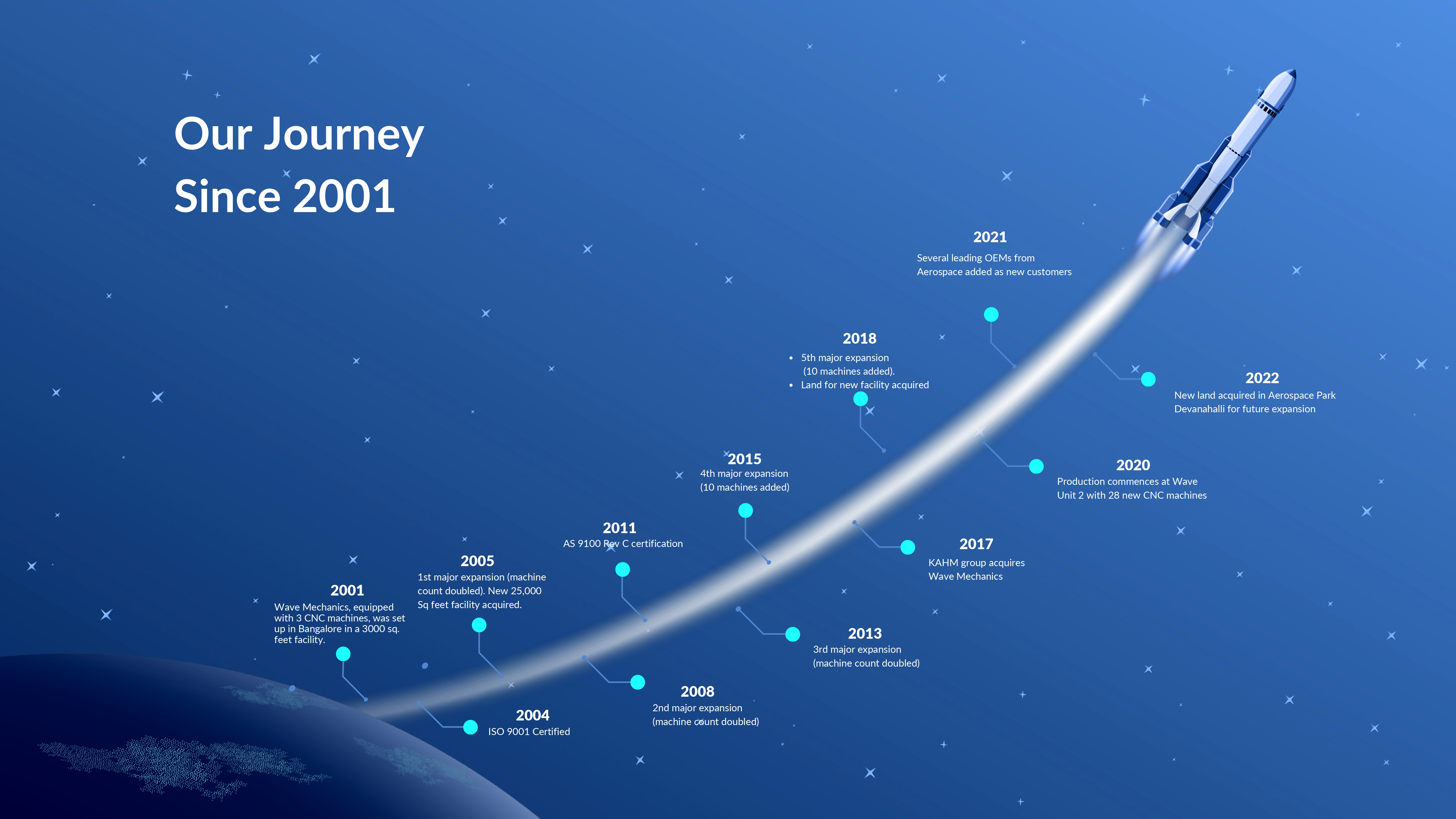 Wave Mechanics underwent an ownership and management change in 2017 to the KAHM Group and has since been under the leadership of Harshvardhan Dalmia and Mayank Dalmia. Since 2017, Wave Mechanics has transformed to a full turnkey, digitally enabled, Build-to-Print precision manufacturer working with some of the largest primes & OEMs around the world in high-tech industries such as Aerospace, Electronics, Semiconductors & Medical.